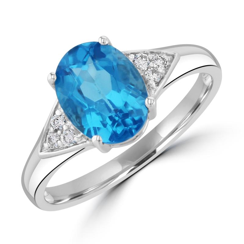 7X9 OVAL BLUE TOPAZ WITH THREE ROUND DIAMONDS ON EACH SIDE RING